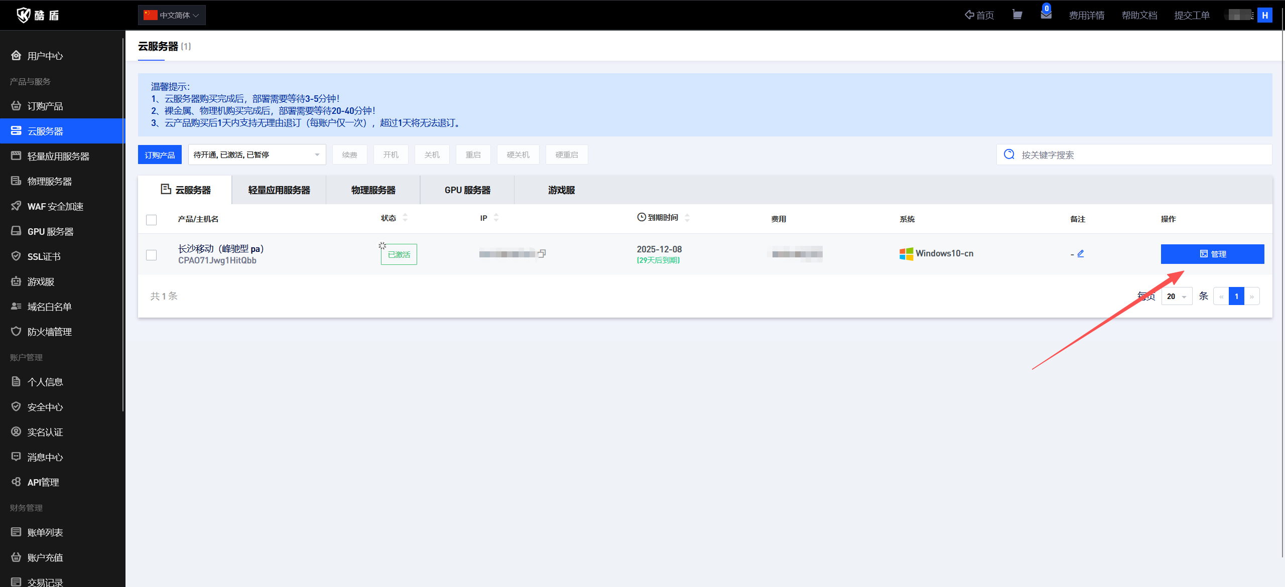 购买服务器后,找到对应的服务器产品点击管理进去。